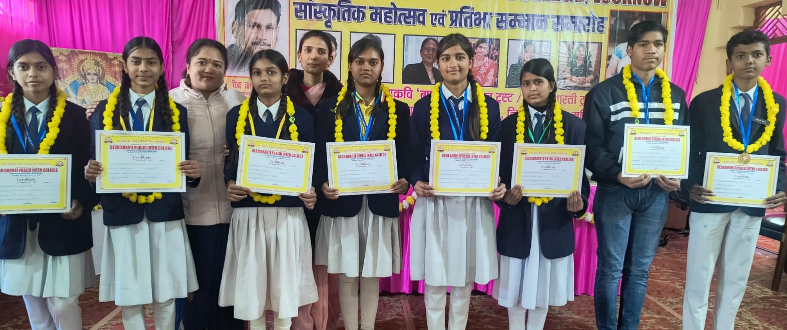 लखनऊ : देश भारती पब्लिक इन्टर कॉलेज राजाजीपुरम में सांस्कृतिक महोत्सव एवं प्रतिभा सम्मान समारोह में मेधावियों को सम्मानित किया गया। प्रतिभा सम्मान समारोह के दूसरे दिन शनिवार को कार्यक्रम की शुरुआत में संस्था के प्रबन्धक राष्ट्रीय कवि वेदव्रत वाजपेई ने दीप प्रज्जवलित करके भारत माता और सरस्वती के चित्र का पूजन किया। इस दौरान समाजसेवी राकेश दीक्षित, सुशील मिश्रा, अरविन्द गुप्ता ने भी चित्र पूजन किया। विद्यालय के प्रधानाचार्य जय व्रत वाजपेयी ने आये हुए अतिथियों को सम्मानित किया। विद्यालय के मेघावी बच्चों का अभिनंदन किया गया।