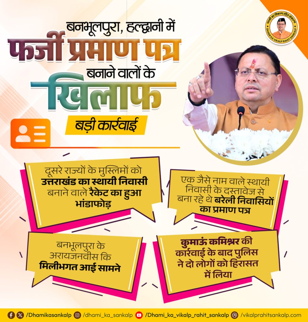 सीएम पुष्कर सिंह धामी ने हरिद्वार,नैनीताल, उधम सिंह नगर और देहरादून जिले में इस तरह के मामले संज्ञान में आने पर प्रशासन से कड़ा रुख अपनाने के लिए गृह सचिव शैलेश बगौली को निर्देश दिए है। नैनीताल जिले के हल्द्वानी बनभूलपुरा क्षेत्र में बीती शाम कुमायूं आयुक्त ने छापा मार कर एक जनसेवा केंद्र से फर्जी स्थाई निवास प्रमाण पत्र बनाने का मामला रंगे हाथ पकड़ा था इसमें फैजान मिकरानी नाम के जनसेवा केंद्र संचालक की भूमिका पायी गई जिसके खिलाफ पुलिस में तहसीलदार की तरफ से तहरीर भी दी गई है।