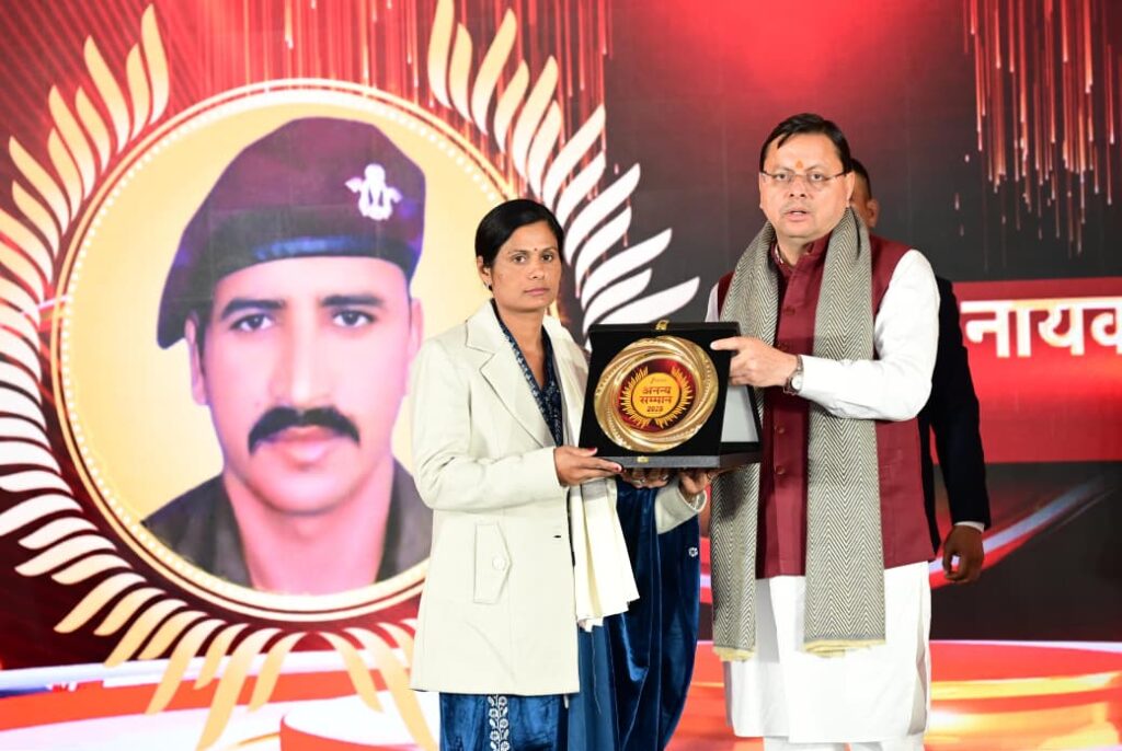 देहरादून: मुख्यमंत्री श्री पुष्कर सिंह धामी ने शुक्रवार को सहस्त्रधारा रोड, स्थित एक होटल में उत्तराखंड अनन्य सम्मान कार्यक्रम में प्रतिभाग किया। इस दौरान मुख्यमंत्री ने शहीद सैनिकों के परिजनों को सम्मानित किया। मुख्यमंत्री ने शहीदों को श्रद्धांजलि अर्पित करते हुए कहा कि शहीदों के परिजनों का संघर्ष, पीड़ा और देश के प्रति अटूट निष्ठा हम सभी के लिए प्रेरणा है। उन्होंने कहा देवभूमि उत्तराखंड वीरभूमि के रूप में भी जाना जाता है। प्रदेश के लगभग प्रत्येक परिवार का सदस्य सेना या अर्ध सैनिक बलों से जुड़ा हुआ है। उत्तराखंड के वीर सपूतों ने अपने प्राणों की बाजी लगाकर मातृभूमि की रक्षा की है।