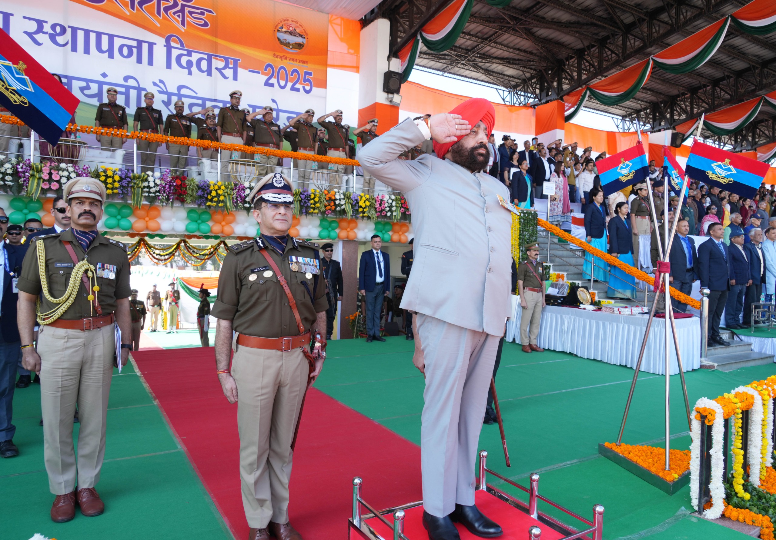 देहरादून: उत्तराखण्ड राज्य स्थापना के रजत जयंती समारोह के अवसर पर शुक्रवार को पुलिस लाइन, देहरादून में आयोजित कार्यक्रम में राज्यपाल लेफ्टिनेंट जनरल गुरमीत सिंह (से नि) एवं मुख्यमंत्री श्री पुष्कर सिंह धामी ने प्रतिभाग किया। राज्यपाल ने इस अवसर पर आयोजित रैतिक परेड का निरीक्षण कर सलामी ली। राष्ट्रीय गीत ‘‘वंदे मातरम’’ के 150 वर्ष पूर्ण होने के अवसर पर कार्यक्रम की शुरुआत वंदे मातरम गीत से हुई। इस अवसर पर राज्यपाल एवं मुख्यमंत्री द्वारा ‘‘उत्तराखण्ड पुलिस पत्रिका-2025’’ का विमोचन एवं रजत जयंती पदक के प्रतीकात्मक चिन्ह का अनावरण किया गया।