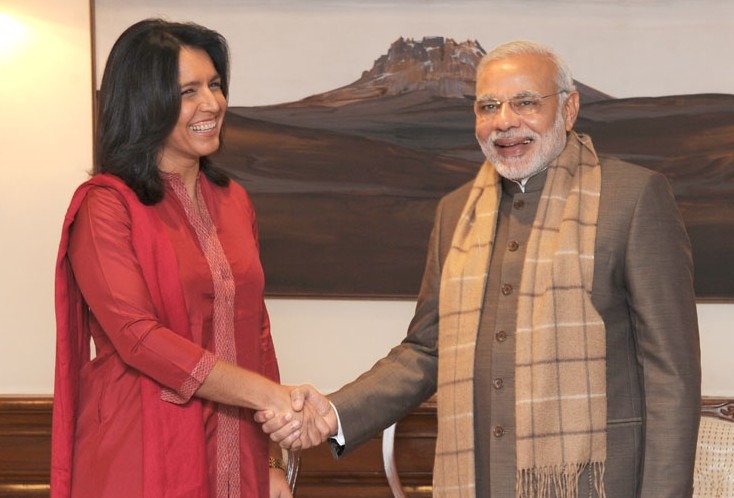 तुलसी बाइस वर्षों से प्रधानमंत्री नरेंद्र मोदी का समर्थन करती रही हैं। जब अमेरिकी सरकार ने साल 2002 के गुजरात दंगों में कथित भूमिका की वजह से तत्कालीन मुख्यमंत्री नरेंद्र मोदी को वीज़ा देने से मना कर दिया था तो तुलसी उन चुनिंदा नेताओं में शामिल थीं जिन्होंने सरकार के इस फ़ैसले की आलोचना की थी। मोदी को यह याद रहा। इतना ही नहीं तुलसी ने एक स्कूल में झाड़ू लगाकर मोदी के स्वच्छता अभियान का समर्थन भी किया था। प्रधानमंत्री मोदी जब योग को वैश्विक पटल पर लाने के लिए कोशिश कर रहे थे तब तुलसी ने इस मुहिम का जमकर समर्थन किया था। सितंबर 2014 में जब प्रधानमंत्री मोदी से उनकी पहली मुलाक़ात हुई थी तो उन्होंने पीएम मोदी को उपहार के तौर पर भगवत गीता दी थी। अर्थात मोदी की यह भक्तिन अमरीकी खुफिया को भारत के राष्ट्रीय हित में बनाने में मददगार रहेगी।