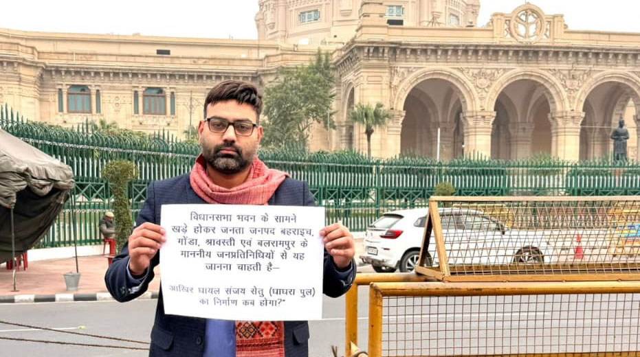 लखनऊ : प्रदेश में विकास के बड़े-बड़े दावों के बीच संजय सेतु (घाघरा पुल) आज भी बदहाली का शिकार है। इसी उपेक्षा के खिलाफ सामाजिक कार्यकर्ता संजीव सिंह राठौर ने विधानसभा भवन के सामने खड़े होकर बहराइच, गोंडा, श्रावस्ती और बलरामपुर की लाखों की आबादी का दर्द सत्ता के सामने रख दिया। हाथ में तख्ती लेकर उन्होंने तीखे शब्दों में सवाल किया— “जब सरकार हर ओर विकास का दावा कर रही है, तो आखिर घायल संजय सेतु का निर्माण कब होगा?