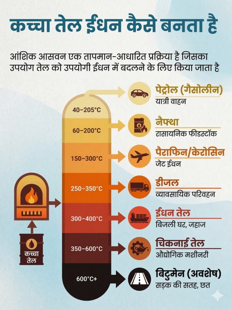 कच्चा तेल वास्तव में विभिन्न प्रकार के हाइड्रोकार्बन का प्राकृतिक मिश्रण होता है, जिसे सीधे उपयोग में नहीं लाया जा सकता। इसे उपयोगी ईंधनों में बदलने के लिए रिफाइनरी में आंशिक आसवन यानी फ्रैक्शनल डिस्टिलेशन की प्रक्रिया अपनाई जाती है।